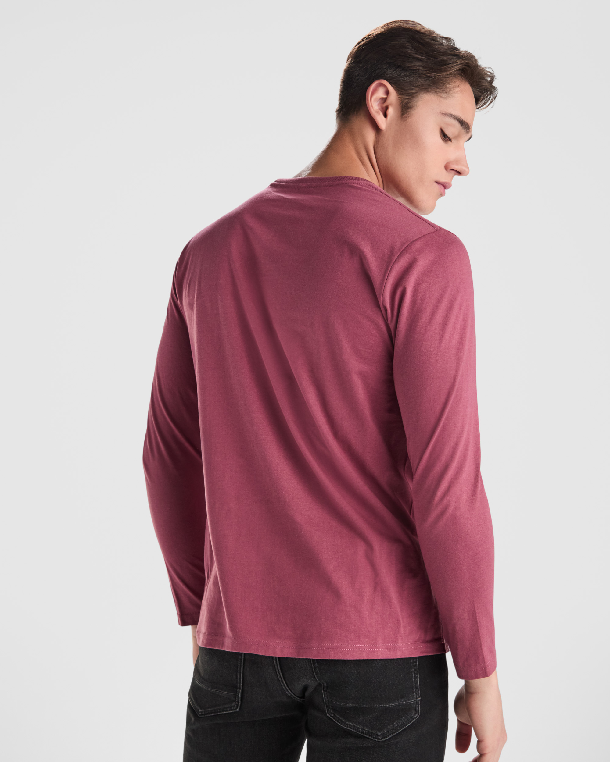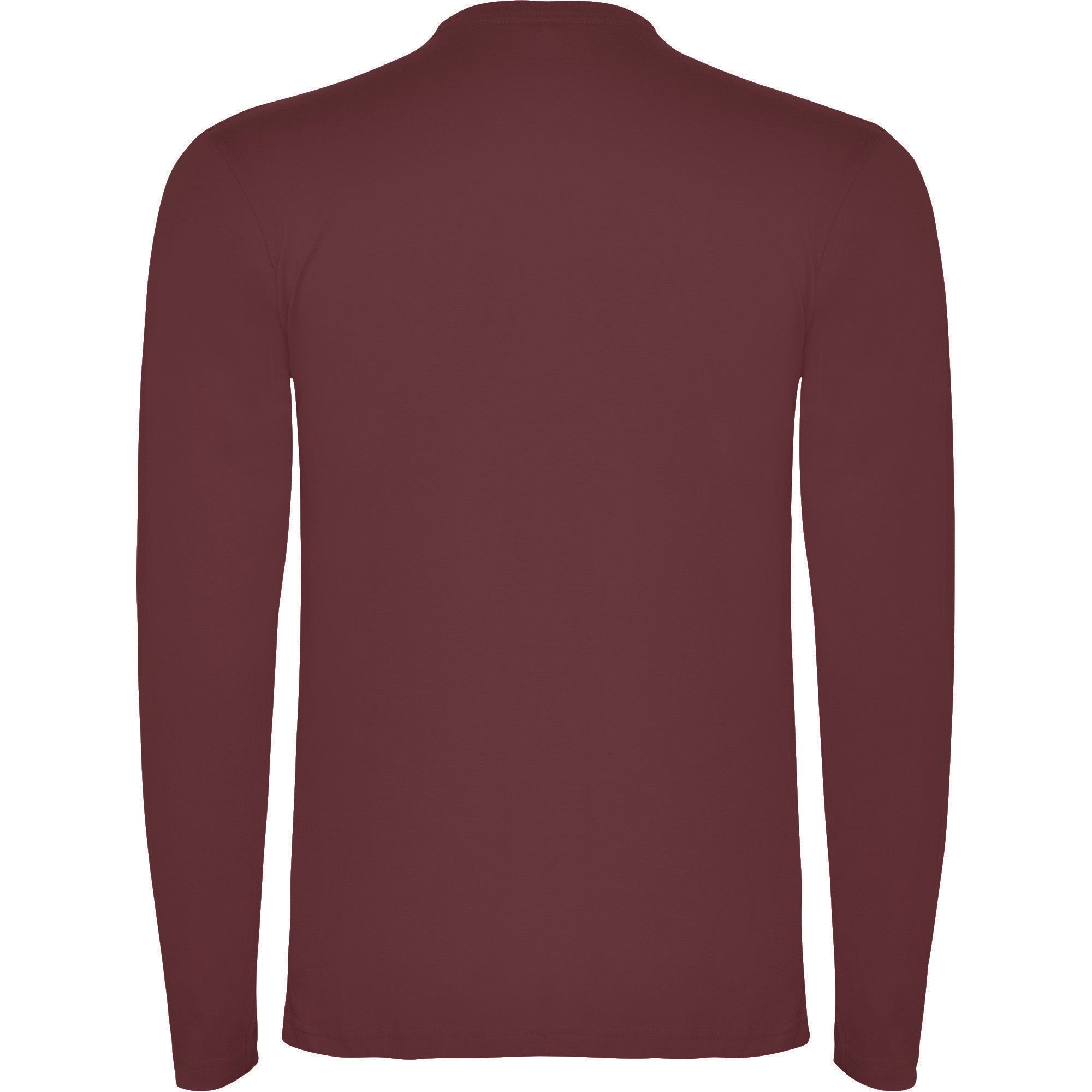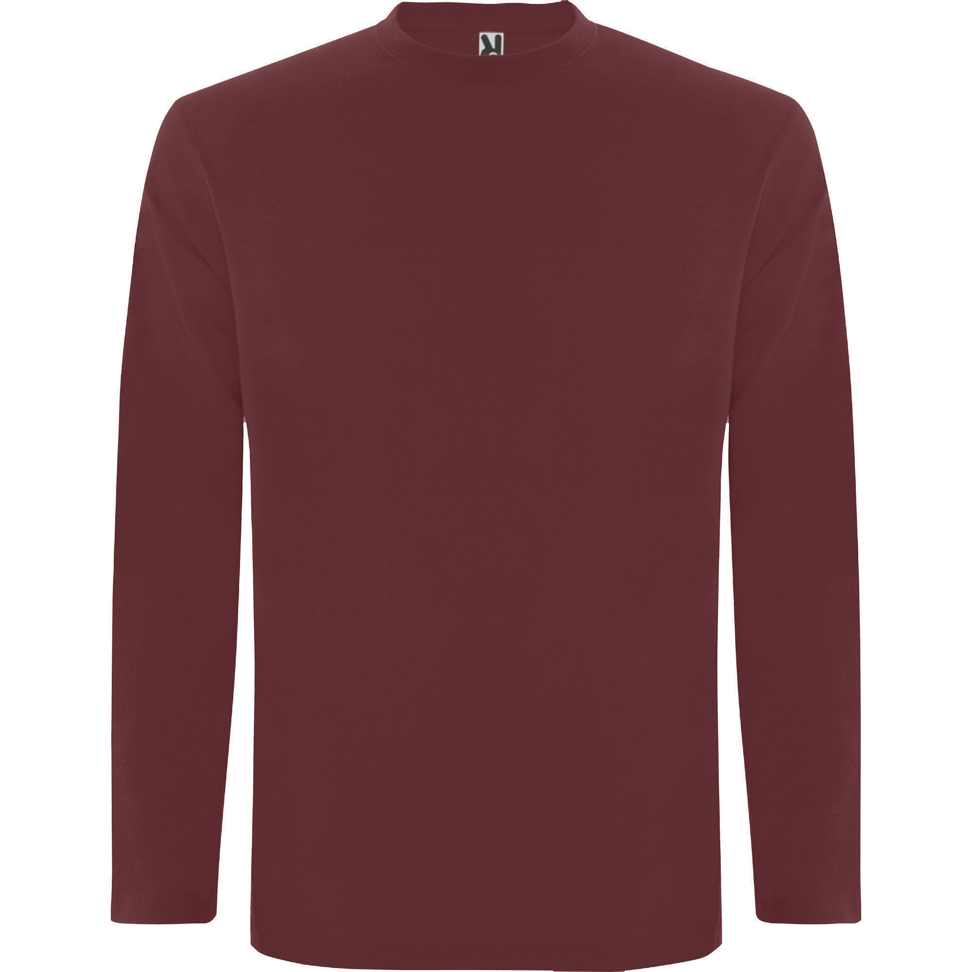 Camiseta de manga larga tubular en tallas de adulto y costuras laterales en tallas de niño. Cuello redondo en canalé 1x1 (4 capas). Cubrecosturas en cuello del mismo tejido.
