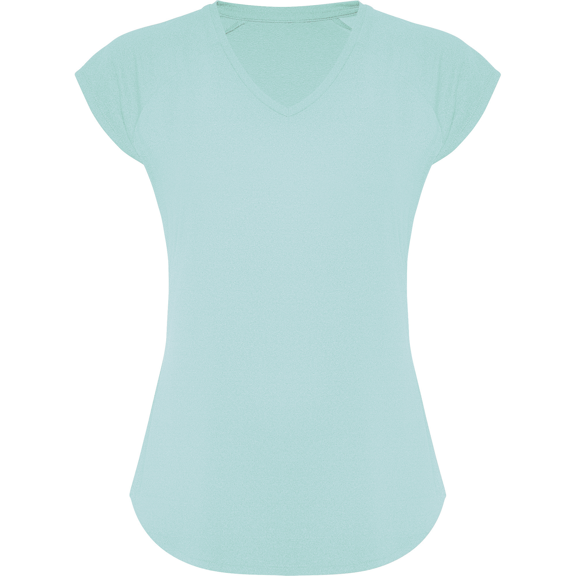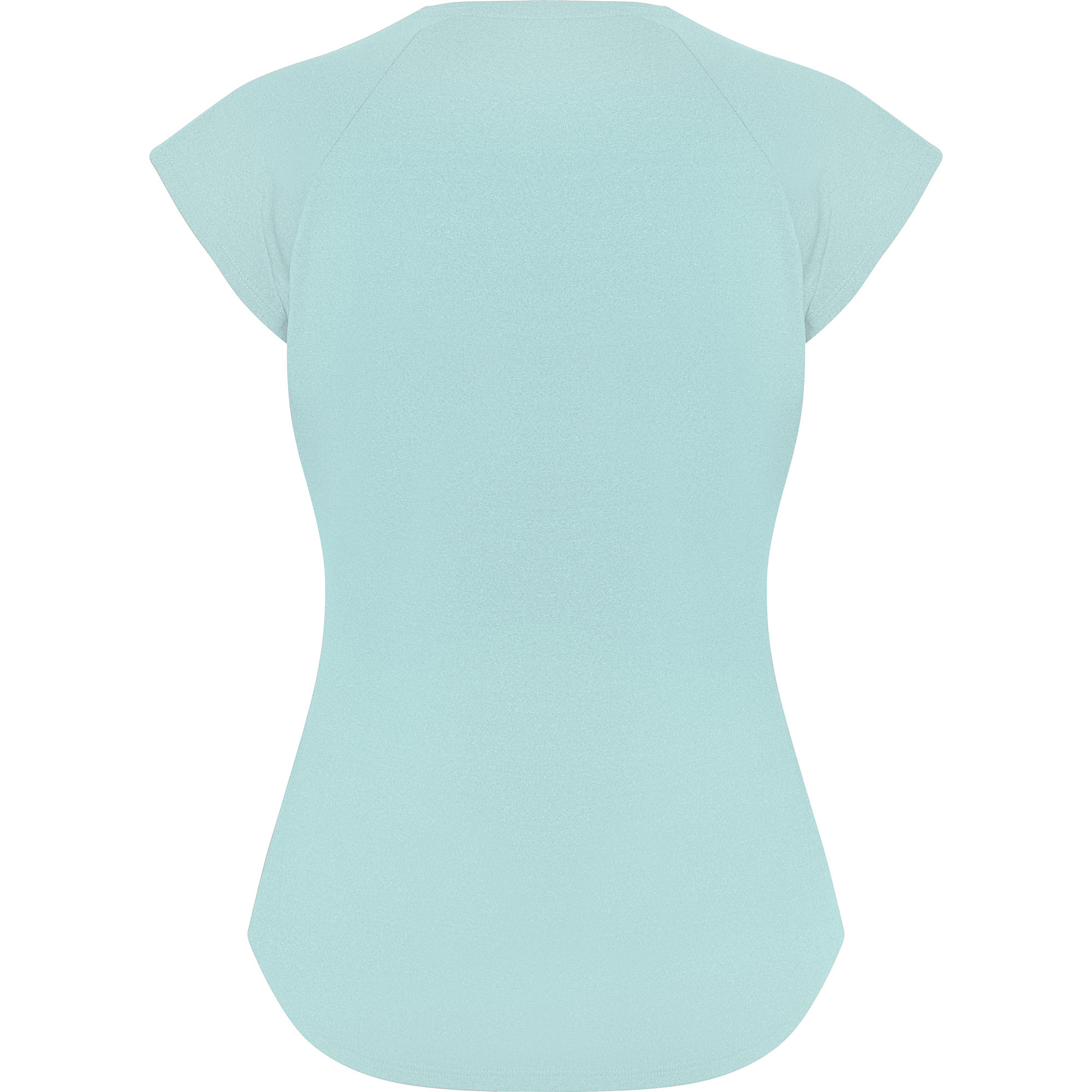Camiseta técnica multideporte para mujer con manga ranglán. Cuello pico. Tejido poliéster con tacto algodón. Corte entallado. Bajo con forma curva. Costuras overlock a tono en bajo y mangas. Logo Roly reflectante en bajo lateral izquierdo.