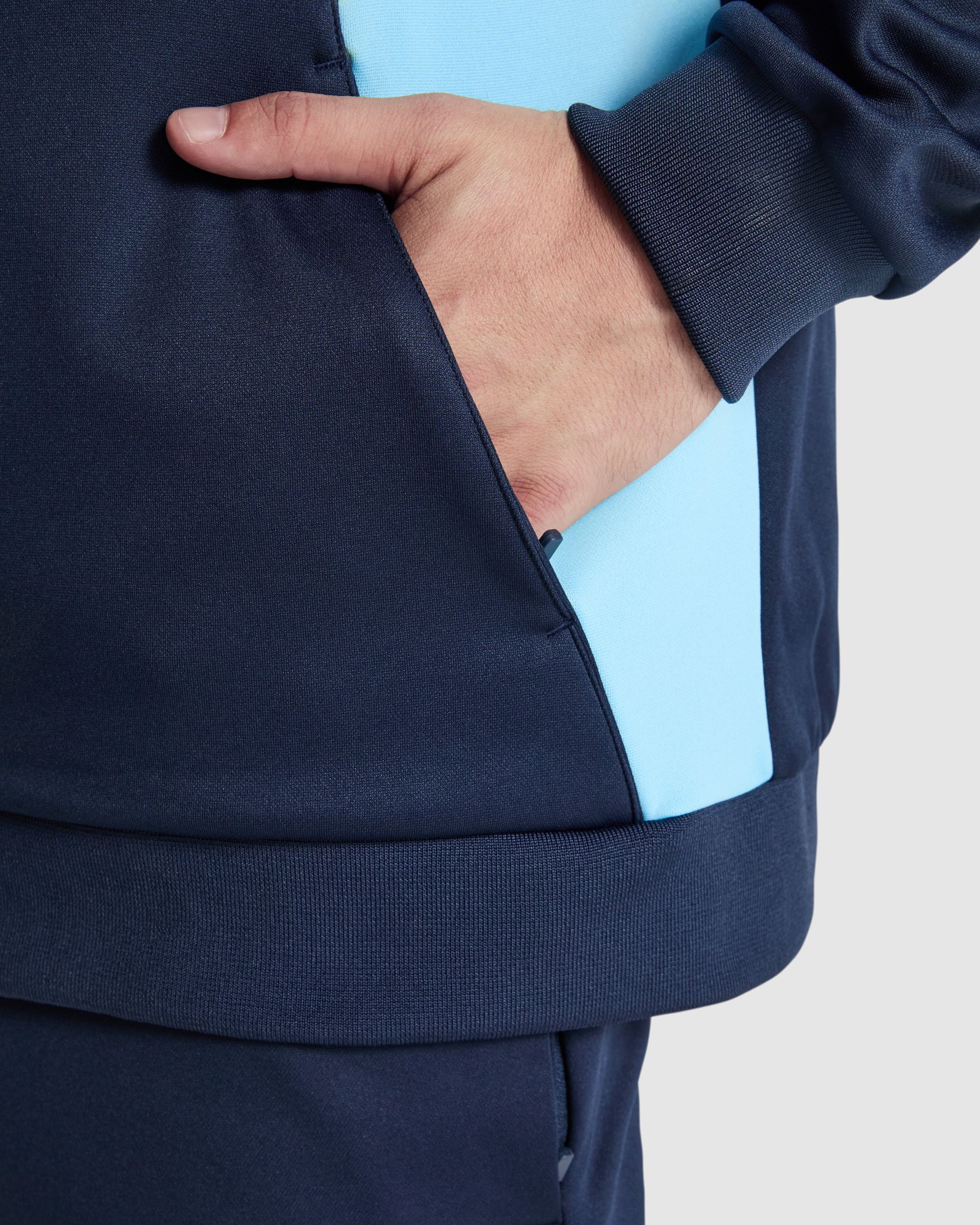 Chaqueta deportiva con cremallera frontal perchada. Bolsillos laterales con cremallera. Piezas a contraste de color, una blanca en pecho especial para bordados. Cuello, puños y cintura en canalé de 1x1.