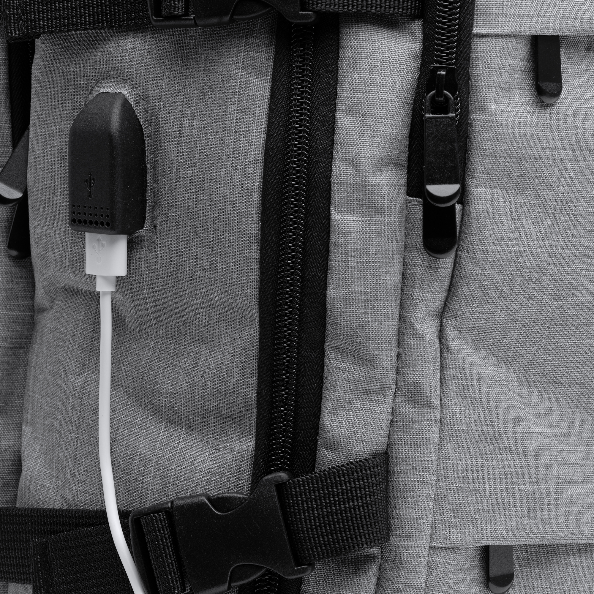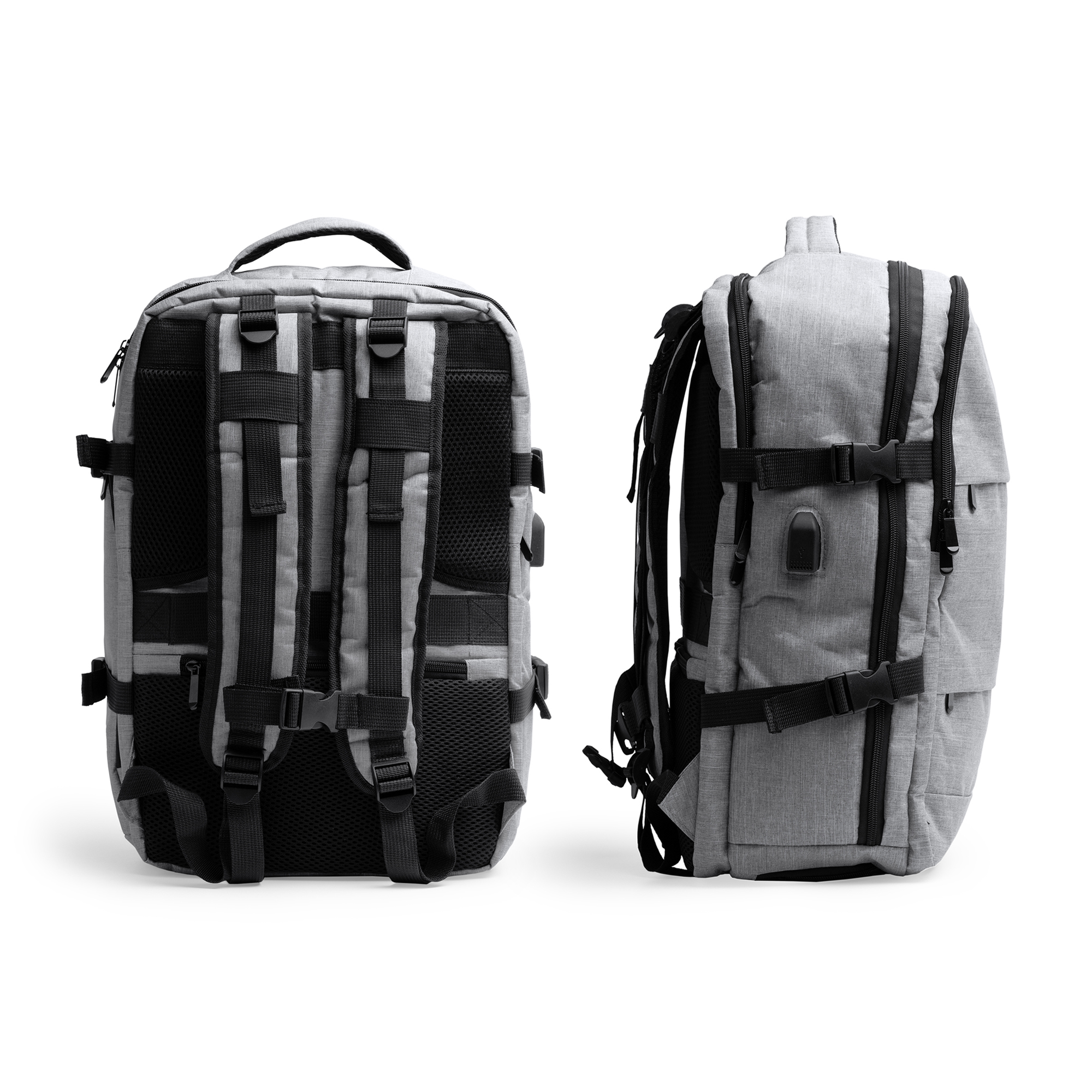 Mochila de viaje realziada en poliéster reciclado RPET, diseñada para comodidad y funcionalidad. Cuenta con espalda y asas acolchadas, 2 bolsillos exteriores frontales y 3 amplios compartimentos principales. Incluye un compartimento acolchado para portátil de 17,3", salida USB con cable micro USB para conectar un Power Bank (no incluido), y un compartimento transpirable para zapatillas. Con bolsillo antirrobo en la parte trasera y cinta para trolley, ofrece una capacidad de 30 litros para viajes organizados y seguros.
