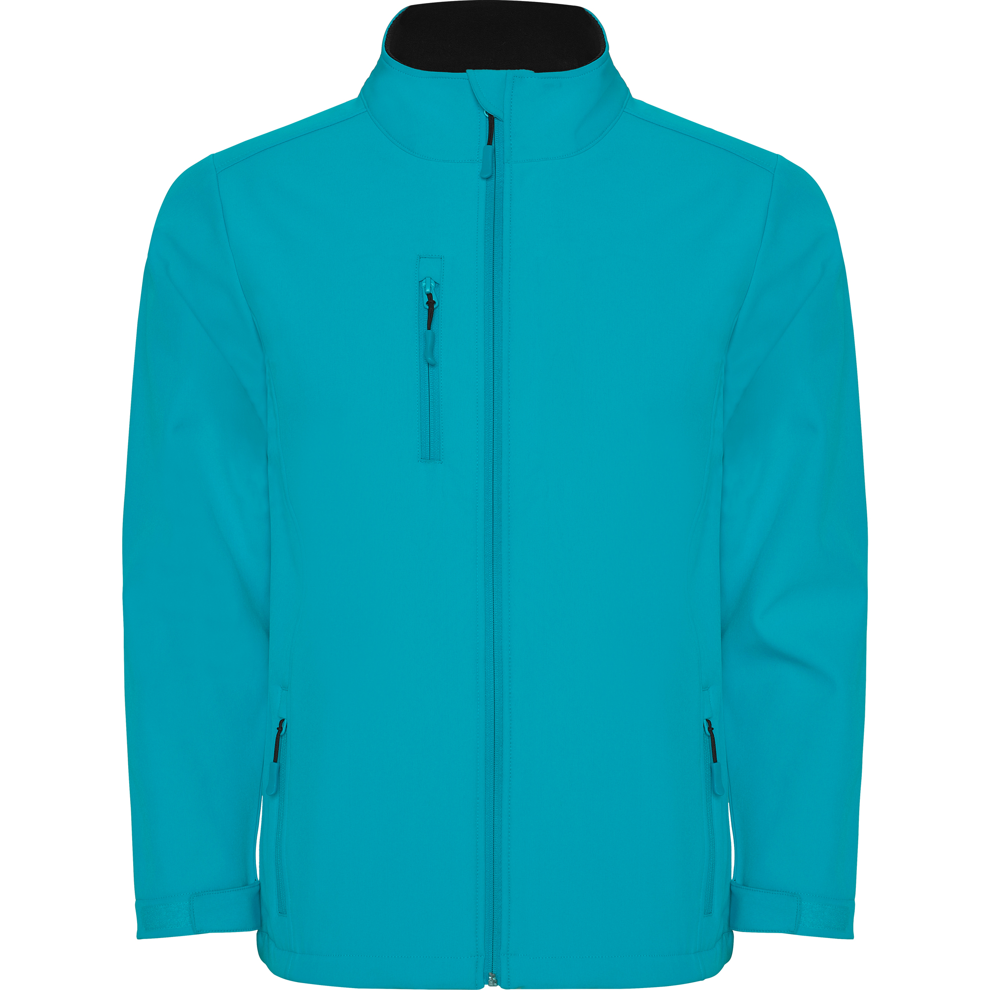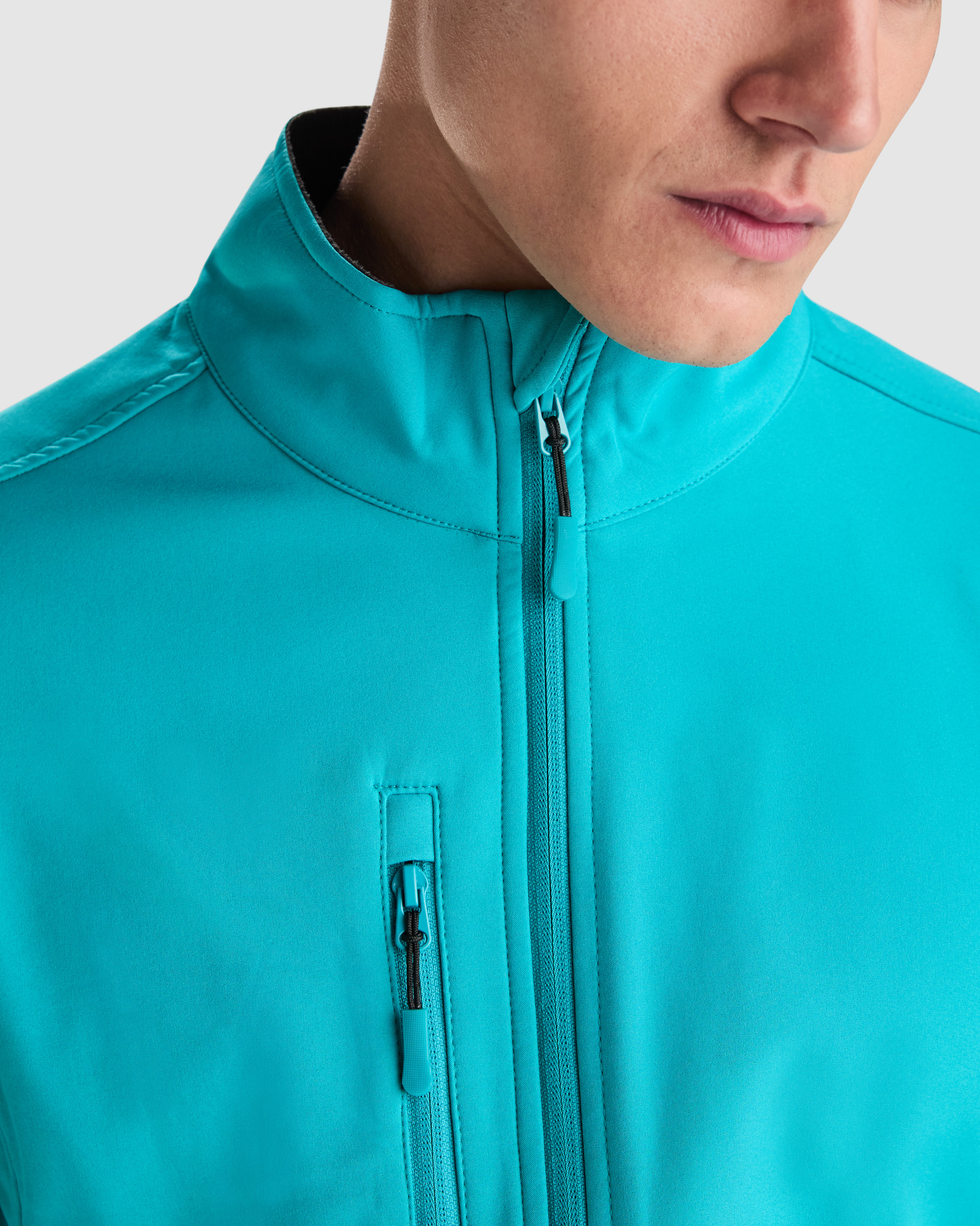 Chaqueta softshell de 2 capas con cremallera frontal invertida. Repelente al agua y resistente al viento. Interior en tejido micropolar. Dos bolsillos laterales y uno en pecho derecho con cremalleras invertidas. Protector de barbilla del mismo tejido invertido. Ajustadores laterales en el interior en tallas de adulto.